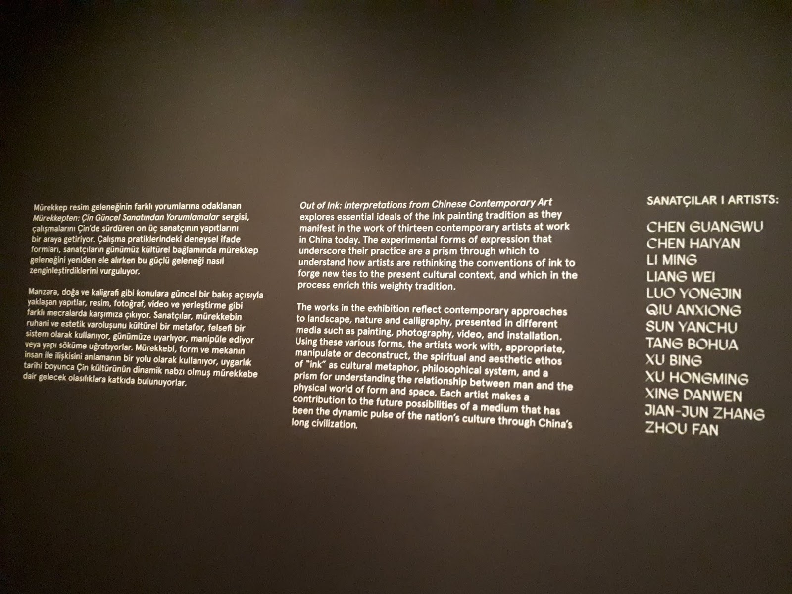 Geçen hafta Pera Sanat Müzesi'ndeki Out of Ink - Mürekkepten Sergisine gittim. Sergi Çin Güncel Sanatından Yorumlamalar başlığıyla sunuluyor. Sergi gezerken en sevdiğim şey eserlerin hikayelerini okumak. Eğer o gün normalden fazla kalabalık bir izleyici kitlesi varsa ve flaşsız fotoğraf çekilmesine izin veriliyorsa önce açıklama metinlerinin fotoğrafını çeker evde sakin kafayla okurum.